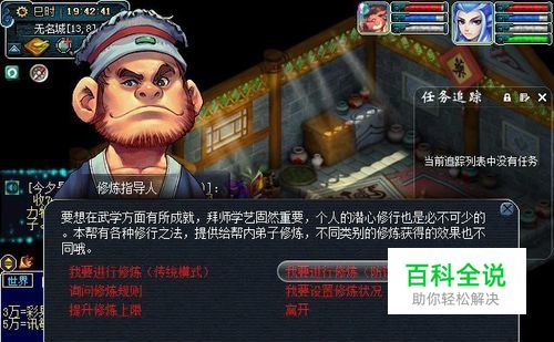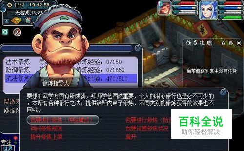 重点来了! 第一时间赶到帮派药房的不一定是抢资材最大的人!而是你如何抢! 看下图:点击药房修炼指导人后会出现6个选项!你只需选择上面的两种!一种是传统模式!一种是防误差模式!先点击防误差模式——选择你要修炼的类型(如我现在的抗法)先别点!把对话框拖至左下角!然后再次点击修炼指导人!选择传统模式——选择你要修炼的类型!