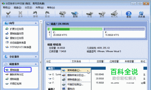 2、选中磁盘1,然后点击磁盘操作下的“复制磁盘”选项;或右击磁盘1,在弹出的菜单中选择“复制磁盘”选项,如下图2: