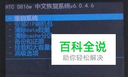 进入之前刷好的第三方recovery(recovery进入方法:将手机彻底关机,在关机的状态下,按住“电源键+音量下”进入Hboot;在“Hboot”界面下按音量下选择“recovery” 进入recovery界面)