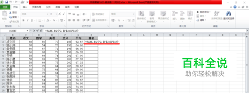 再在第一个的地方输入rank公式,=rank(对象的总分,总共的分数区域),总共的分数区域一定要绝对引用,按住f4