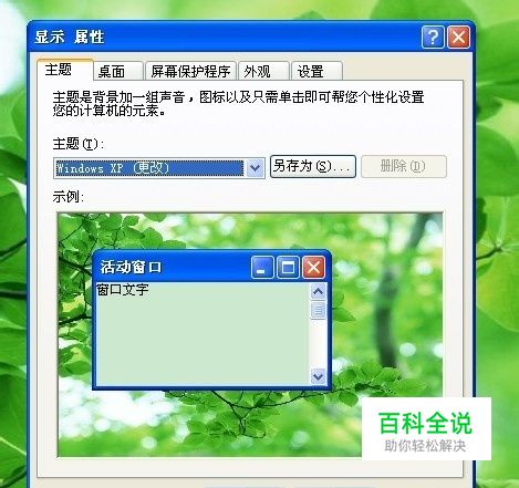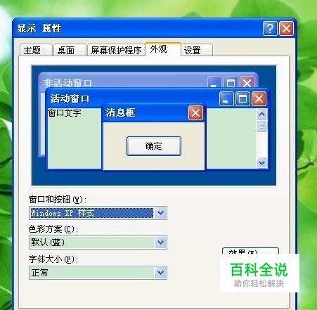 现在的上班族每天都要对着电脑,怪辛苦的。白花花的屏幕很伤眼睛。如何给电脑设置一个桌面主题背景色呢,那种柔和的淡雅的小清新绿色,看起来最舒服了。下面跟我一起来学习吧。 1.在桌面上的空白出右键点击属性,弹出属性对话框如下图所示。 2.选择里面的外观TAB页面如下图所示。 3.点击下方的高级选项。弹出高级选项面板如下图所示。 4.选择项目里的窗口选项。如下图所示。 5.点击颜色1下的颜色选项下拉框。弹出颜色面板。创建一个新的自定义颜色,如下图所示, 色调:84,饱和度:91,亮度:205 6.选择自定义的绿色小清新为颜色选项。然后进行保存,关闭属性面板。设置好的主题就如下图所示。