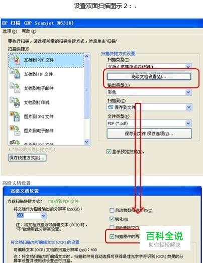 使用hp扫描的文档扫描仪如何设置双面扫描 首先要选择扫描快捷方式列表里扫描文档的选项,右侧更改设置——选择高级文档设置——选择扫描文件的两面即可。