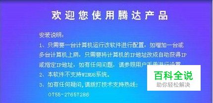 在欢迎页面点击开始按扭进入产品说明页面,该页面显示产品的说明,型号和向导的版本号。因该向导属于腾达网络自行开发的安装系统,厂家会不定期的对向导进行升级。记住向导的版本号有利于用户及时升级现有的向导,如下图: