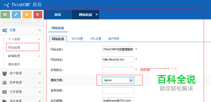 为自己的模板想个好的名字,如:demo () 到后台启用你的模板 设置->网站信息->模板方案->选择demo->提交保存; 然后到前台查看,如果出现下面的异常证明你的配置成功了