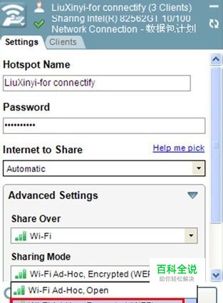 设置Advanced Settings。 share over 设置为Wi-Fi. 如果显示wifi Disabled,则是因为wifi没有打开。 sharing mode设置为Wi-FiAd-Hoc,Encrypted(WEP)