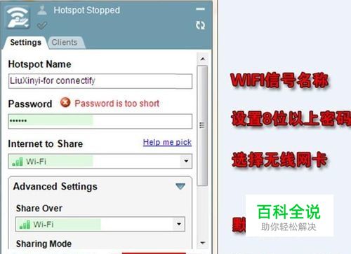 点击start hotspot,启动wifi。 此时, 笔记本即可发射无线信号。