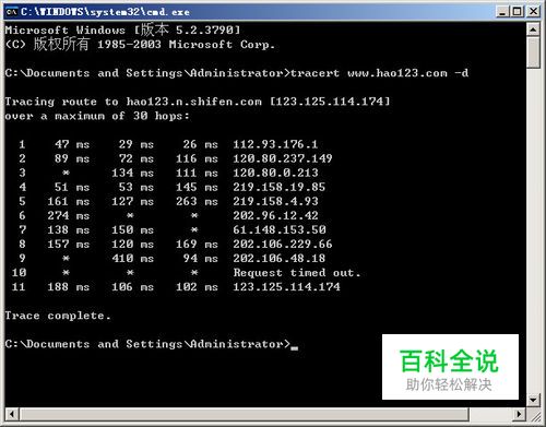 在弹出的对话框中,输入tracert命令,例如:tracert www.hao123.com -d,然后按Enter键,稍等片刻,就会出现很多时间,例如29ms,如果时间越长,就表示你访问的该网站需要等待的时间越长,时间越短越快;