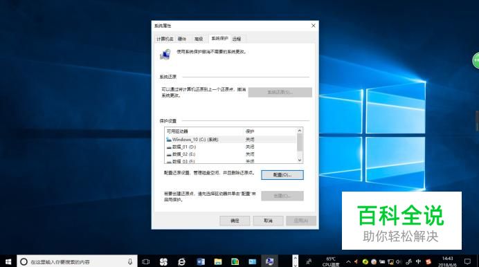 如图所示,弹出"系统属性"对话框。选择"系统保护"标签,点击"保护设置→配置..."按钮。