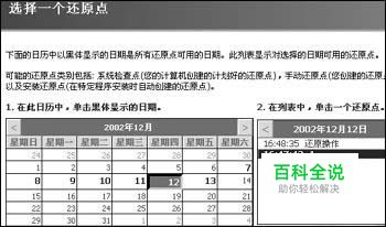 还原系统 电脑出现问题或误删了文件后,系统还原就派上大用场了。打开“开始”菜单,选择“程序→附件→系统工具→系统还原”命令,选择“恢复我的计算机到一个较早的时间”,单击“下一步”按钮选择还原点,在左边的日历中选择还原点创建的时间后,右边就会出现这一天中创建的所有还原点,选中想还原的还原点(如图2),单击“下一步”即可进行系统还原,这时系统会重启并完成系统的还原。 图2