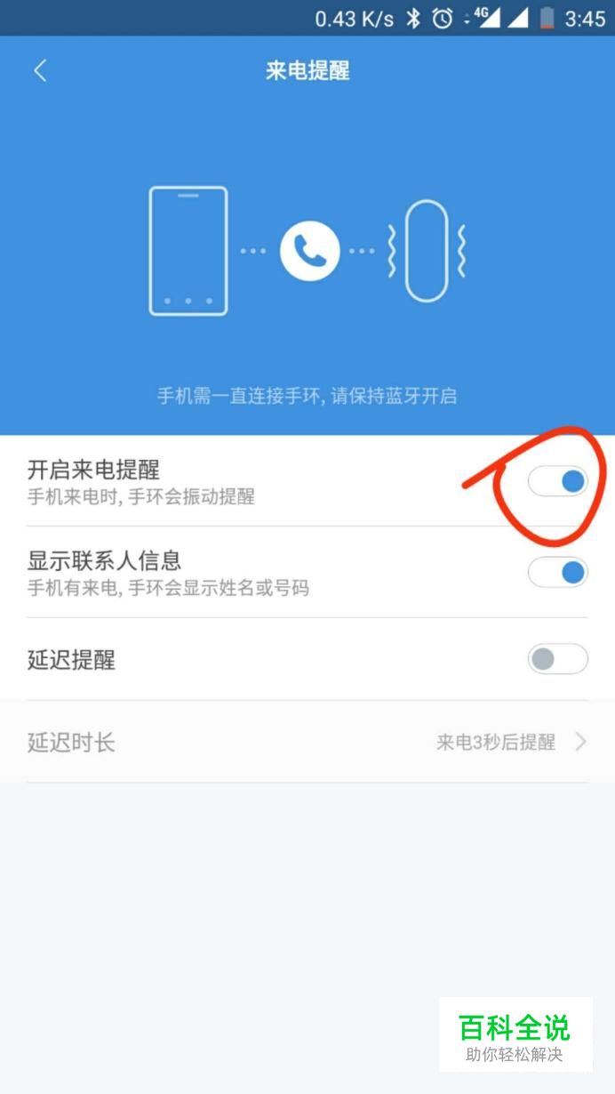 点击来电提醒后,将来电提醒打开,下方显示联系人会自动打开,不需要理会,这样你的小米手环就会显示来电提醒和显示联系人了