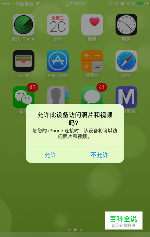 将苹果手机视频传到电脑上的方法有二,一种是通过数据线传输,一种是通过第三方软件QQ来实现。现在先来看看第一种方法。 用数据线将手机与电脑连接,手机上会弹出一个暖是否允许访问视频与照片的提示,选择允许
