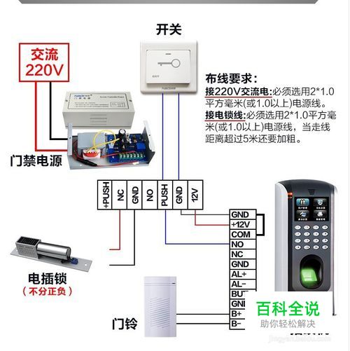 电插锁:正常就是12V就可以了,只要对应的接到门禁电源的NC和GND就可以了;最起码要用2*1平方的电源线