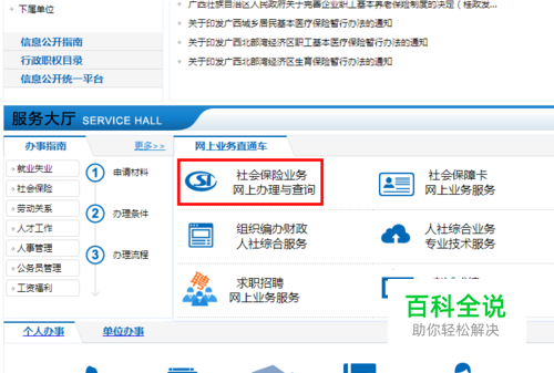 在网页中部“服务大厅”一栏有“社会保险业务网上办理与查询”,这是办理社保网上业务的主要入口;