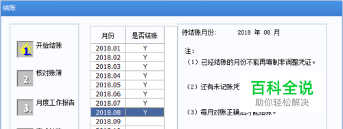 输入密码口令后,2018年8月份对应的“Y”消失,反结账成功!点击“取消”按钮,退出结账窗口。