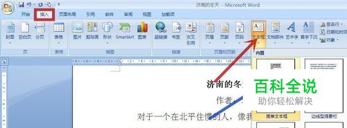 点击顶端的“插入”选项卡(图中红框),再点击“文本框”(图中红色箭头所指),这里选取“简单文本框”(图中蓝色箭头所指)为例