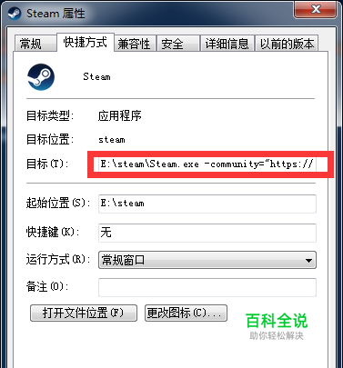 随后我们打开桌面上的steam图标,右击选择“属性”然后在目标的后方增加 空格-community="https://steamcommunity.com"然后点击确定。