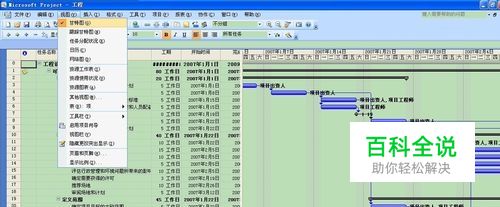 “甘特图”视图: “甘特图”视图是Project 2007的默认视图,用于显示项目的信息。它有两个区域,用两种方式显示项目信息。 1)视图的左侧用工作表显示任务信息,例如任务名称,任务开始时间,结束时间,任务工期,以及为任务分配的资源等。 2)视图的右侧用条形图显示任务的信息,条形图在时间刻度上的位置和长度代表了任务的起止时间及工期长短,每一个条形图代表一项任务,各条形图之间的位置关系也可以表明任务是否有关联,是串行还是并行等等。