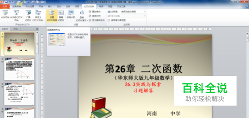 第一步:【方法1】在PPT2010中打开设置自动播放的幻灯片,单击“幻灯片放映”选项卡,在“设置”组中单击“设置幻灯片放映”按钮。