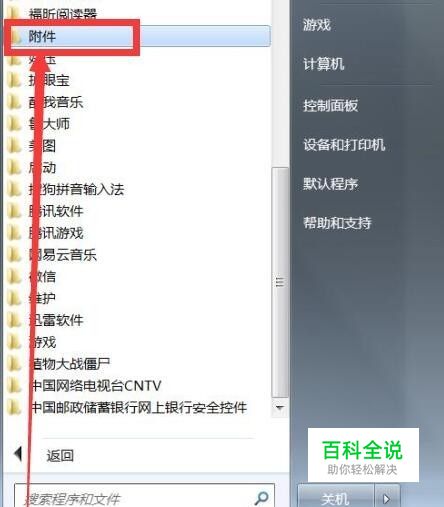 在打开的菜单中,点击所有程序,查找附件文件夹。如下图所示