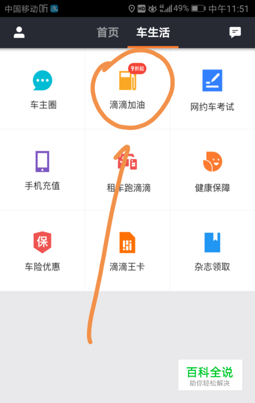 进入滴滴车主之后点按车生活中的滴滴加油标志。