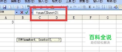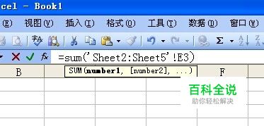 这个时候编辑栏的公式为:=sum('Sheet2:Sheet5'!,如图所示。