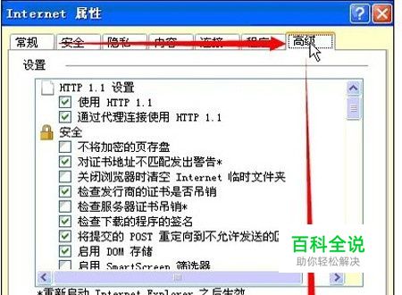 1、右键点击IE游览器的属性,在弹出的“Internet 属性”选项卡中点击“高级”选项;