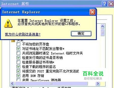 3、按照前面的提示先关闭所有的窗口程序,再次点击重置,弹出“重置 IE游览器 设置”窗口;