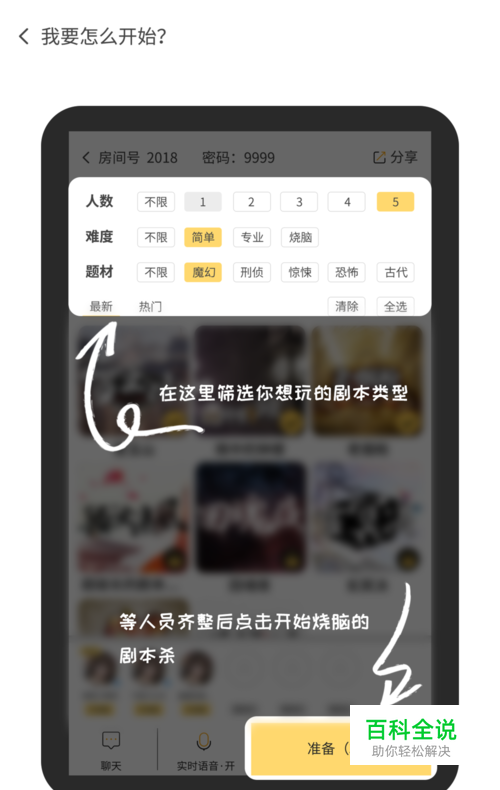第二步:选择剧本并开始 通过条件筛选 剧本 的“人数”、“难度”以及“题材”; 点击选择喜欢的剧本、等人员齐整后,点击开始烧脑的剧本杀;