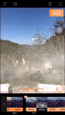 点击后,可以看到很多特效,我们向左滑动,在天气分类下,选取第一个和第二个的效果。选择后,照片上方就会出现烟雾缭绕的效果。也可以调节上方的进度条,来增加烟雾的强度。