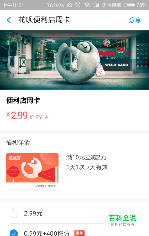 花呗的下发有不少优惠活动,我们找到便利店周卡,如图所示,可以使用积分兑换。