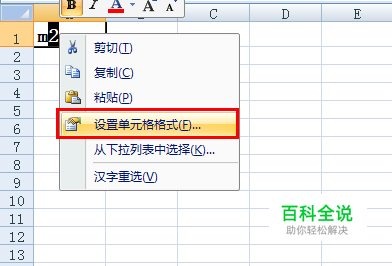 然后选中其中的数字2,右键单击以后选择其中的设置单元格格式。