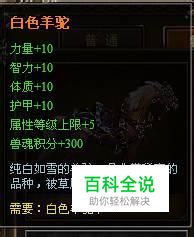 白色羊驼属性: 白色羊驼的属性并不高,力量、智力、体质、护甲各+10点,但是使用之后兽魂积分增加300,是很可观的积分,但是能不能让它屈服在你的脚下就要看你 有没有去争取了哦,活动期间藏宝图碎片的获得办法可以通过完成挑战10次、多人竞技场胜利5次、通关多人副本3次、炼金5次任务获得。