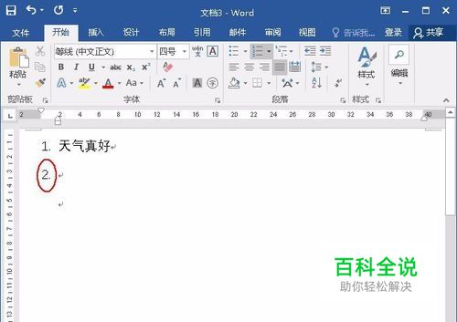 然后我们删掉之前的序号和文字,重新编辑序号和“天气真好”,再按空格键,序号就会自动取消了,这时就可以编辑第二段的“天气真好”了。