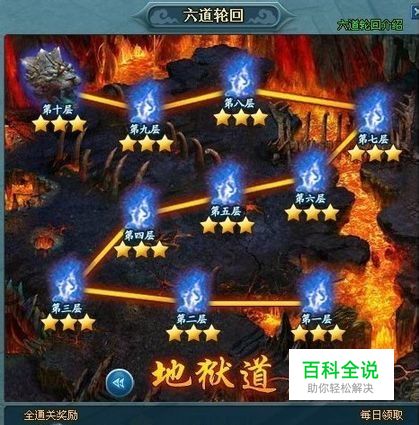 六道轮回副本介绍:1、 六道轮回共分地狱道、饿鬼道、畜生道、修罗道、人间道、天道六道,每道有十个关卡;2、 每道的10个关卡都完成三星通关,可以获得该道的精魂,六道所有的60个关卡全部三星通关总共可以获得六个精魂;3、 根据三星通关的关卡数量,每天可以领取灵魂碎片(碎片用于加强魂器能力);4、 每个关卡三星通关,可以增加每天领取的灵魂碎片数量;注:每日领取每天只能领取一次,点击领取后,再有三星通关后,将不再增加每日领取的数量,同时只能次日才能继续累积继续领取。