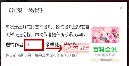 如何给橙光游戏送花? 2025-05-29 14:00:16 是不是还有个别的童鞋还在为如何为喜欢的橙光游戏送花而苦恼呢?那就快来看看我的解答吧! 操作方法 01 先打开一个橙光游戏,然后将页面往下滑,看到图片中我圈出的地方了吗?那里就是送花的地方喽!!! 赞 (0) 相关推荐 橙光游戏怎么获得积分 所谓橙光游戏指的是使用橙光文字游戏制作工具所制作出来的文字游戏,玩家在游戏中可以攻略男主,可以统领后宫,可以仗剑江湖. 喜欢这类型游戏的小伙伴更是不能错过,不仅仅是网页版可以玩,同样还有手机端可以下载 ... 橙光游戏如何设置图片选项 喜欢制作橙光游戏的新手作者们,一定知道不仅可以用文字选项来和玩家互动,也可以用图片选项来和玩家互动,用图片选项会提高你游戏的质量.一个不错的橙光游戏一定少不了图片选项,那么如何设置[图片选项]呢? 操 ... 橙光游戏《人生重启》攻略 橙光游戏<人生重启>所有故事线与女主,成就解锁的相关攻略. 操作方法 01 人生重启是一款互动小说游戏,可以在网页上玩也可以在手机上玩.前半段剧情为免费,大学以后的主线剧情需要25朵鲜花解 ... 怎么自己做橙光游戏? 大家见到一大堆橙光游戏,是不是有点心动,自己也想做一个了呢?这不是梦!那么今天,就让陈昱静来教你,怎么自己做橙光游戏! 操作方法 01 首先,你得要有一个这样的软件. 02 之后按步骤来. 03 要有 ... 你是传奇橙光游戏攻略 下面就是小编带给大家的你是传奇橙光游戏攻略的方法操作,希望能够给你们带来一定的帮助,谢谢大家的观看. 操作方法 01 白羽线:继续躲藏-不动-武林大会-扶起白羽-后院-偷看-将错就错-刺客是谁-都可- ... 橙光游戏制作如何制作“图片选项” 图片选项是做橙光游戏的基础,可是图片选项又怎么做,怎么放入橙光游戏制作中心呢 操作方法 01 打开美图(PS),制作好"点击图片"和"未点击图片". 02 弄好 ... 姻缘劫橙光游戏改名了 最近小编收到很多问题,其中一个就是下面小编为大家整理一下关于姻缘劫橙光游戏改名了的步骤,希望这些方法能够帮助到大家. 操作方法 01 首先,在开头时游戏让你"是否做出选择"时,一定 ... 橙光游戏 好色千金攻略 下面就是小编带给大家的橙光游戏 好色千金攻略方法操作,希望能够给你们带来一定的帮助,谢谢大家的观看. 操作方法 01 我也在玩这个游戏,很不错啊!攻略要和墨池好感度要上70%,和夏弥要上30%,最后要 ... 橙光游戏标题封面的制作(很详细) 橙光游戏标题封面的制作(很详细) 操作方法 01 一,先找一张背景图,最好没有字,没有立绘,像这类的.(如果有的图很喜欢但是只是边角有字你可以用立绘把它盖着)我找到是古代的.直接上网搜查橙光游戏封面图 ...