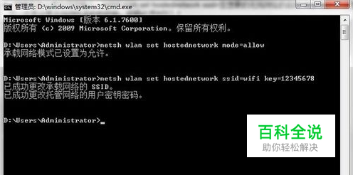 继续在命令提示符中输入:netsh wlan set hostednetwork ssid=您想要的无线网络的名称 key=您想要设置的密码这一步是设置无线网络名称和密码,密码必须8位以上