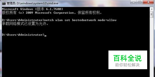 在命令提示符下输入命令:netsh wlan set hostednetwork mode=allow