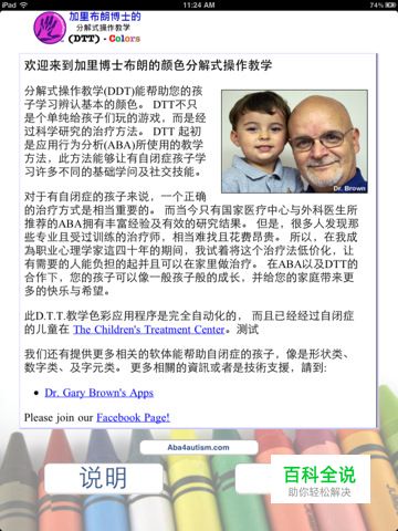 加里布朗博士的自闭症分解式操作颜色教学程式,是使用分解式操作教学(DDT)的原理,来帮助孩子学习基本的颜色。DTT不只是个单纯给孩子们玩的游戏,而是经过科学研究的治疗方法。DTT 起初是应用行为分析(ABA)所使用的教学方法,此方法能够让有自闭症孩子学习许多不同的基础学问及社交技能。此軟題適用於患有此软体适用于患有自闭症、过动症、注意力不足过动障碍症或者是坐不住的孩童。