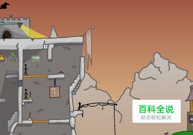 3、点击白色箱盖至落下。点击小人a进入房间。点击关闭 “电”字的左上方和右边的开关,点击蓝色叶状突出物右边使之顺时 针旋转,点击扶梯,使之右其移,点击右边房屋上的黑点,小黑人a 出来爬上棚顶,连点左边的云使其爆炸,尽快点击小黑人a开炮,炸 毁左边楼上地雷。