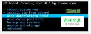 清除用户数据/恢复出厂设置。 选择“-wipe data/factory reset”,清除数据/恢复出厂设置;