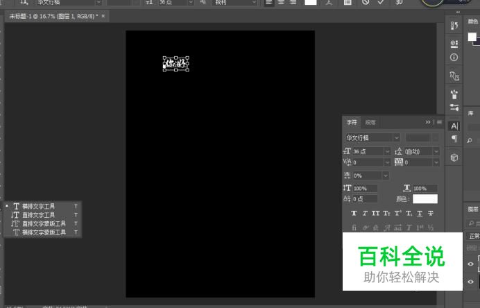 接着点击右边工具栏的文字工具,先选择横排文字工具,点击右边的A|可以对字符或者段落进行设置,横排文字工具下编辑出来的文字就是常规的横着的文字