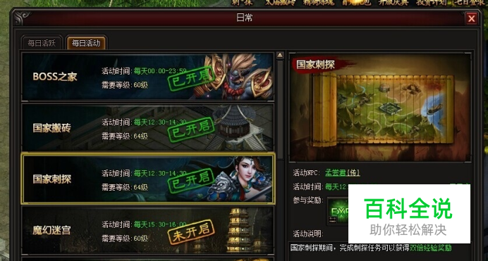 1:国家刺探简介: 玩家等级到达55级后,每天可以接取2次国家刺探任务。任务开启时间为1200—2359分,玩家需要在本国王城NPC孟尝君处接取刺探任务,去敌国王城流浪者处获取敌国情报,然后上交给孟尝君完成任务。每个玩家每天只能领取2次刺探任务。情报的品质分为5种,橙色紫色蓝色绿色白色,品质越高奖励越高,玩家可以通过换取情报获得高品质的情报。 2:国家刺探双倍经验奖励,开启时间,每天12:30—14:00 玩家在国家刺探双倍活动期间,完成任务可以获得双倍的经验奖励。3:玩家刺探情报后,随机获得白色,绿色,蓝色,紫色,橙色中的其中1种情报,玩家可通过更换情报,换取其他颜色的情报,每次换取有CD时间,换取次数越多,CD的时间就越长,品质越高的情报获得的经验和荣誉就越多。 4任务提交 玩家在敌国获得情报后,在本国NPC处孟尝君提交任务获得奖励。