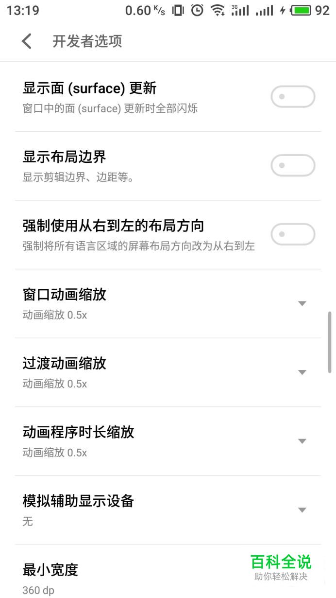 在手机设置开发者选项中,能够看到窗口动画、过度动画以及动画程序时长3个选项。