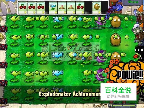 【成就名称】Explodonator 【中文名称】火爆兄弟 【获得条件】用一个樱桃炸弹同时炸死10个正常状态的僵尸 【获得关卡】冒险模式1-10(第一轮) 【出场僵尸】领带、路障、撑杆、铁桶 【选 卡】无