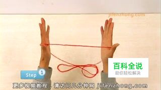 把拇指从外侧的的两根绳之间插进去,勾住中指另一端的绳。