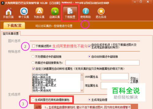 因为现在的商机助理暂不支持本地图片,所以生成的数据包就不能将图片下载到本地电脑。打开大淘营淘宝宝贝复制专家,点击下载配置,将下载描述图片的勾勾去掉,保存配置(如下图所示)