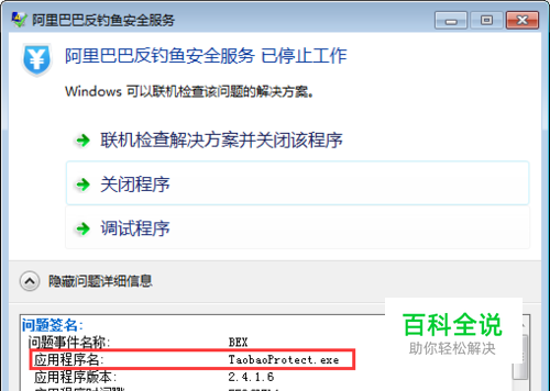 点击”查看问题详细信息“,可看这个应用程序的名,看看是由那个程序引起的,可以看是 TaobaoProtect.exe