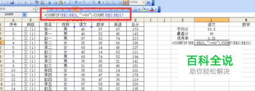 在语文的及格率处输入=COUNTIF(E$2:E$21,">=60")/COUNT(E$2:E$21) 回车之后可以得到语文成绩的及格率,60分及格。