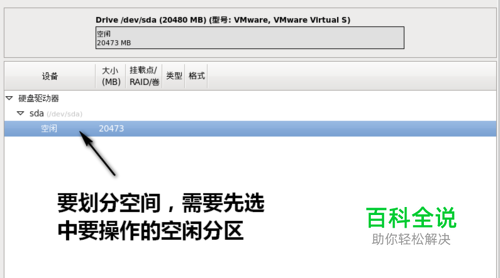随后将进入分区界面。在分区前,请先选中待划分的磁盘空闲空间,然后点击“创建”。