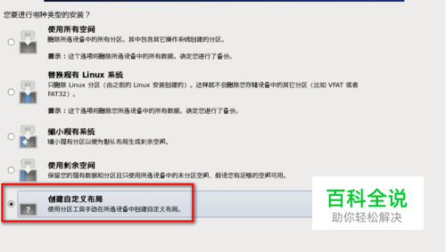 在磁盘划分前,会提示进行哪种类型的安装。在这儿,建议大家选择“创建自定义布局”。